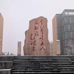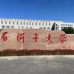 石河子大学校名石:校名石上“石河子大学”由江泽民题写,采用其标志性书法风格,字体端庄工整,其题字背景与该校历史沿革密切相关。由多块花岗岩石材垒砌而成,校名石两边分别携刻有各个时期为石河子大学的题词,体现国家领导人对边疆高等教育的重视。